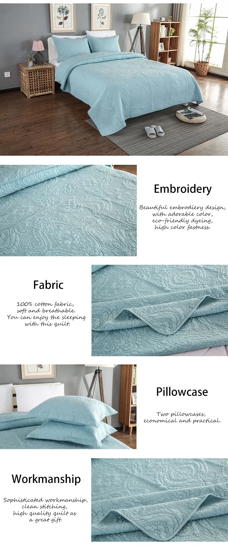 Description | Home Goods Solid Color Cotton Fabric Embroidered Quilt Bedspread | ||||
