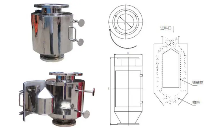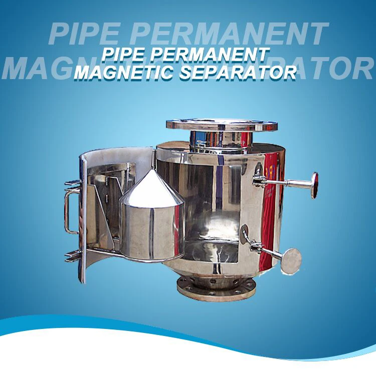 RCYZ vertical pipe permanent magnet iron remover is a kind of energy-saving equipment which produces strong magnetic field attraction with permanent magnet material. It is composed of ND-Fe-B annular magnetic system, conical shape, reasonable structure and high magnetic field strength. It can be connected with solid raw material transportation equipment, movable door buckle, easy to remove iron, suitable for removing iron from all kinds of solid small particles and powder materials in food, flour, ceramics, chemical, cement, building materials, quartz sand and other industries.
