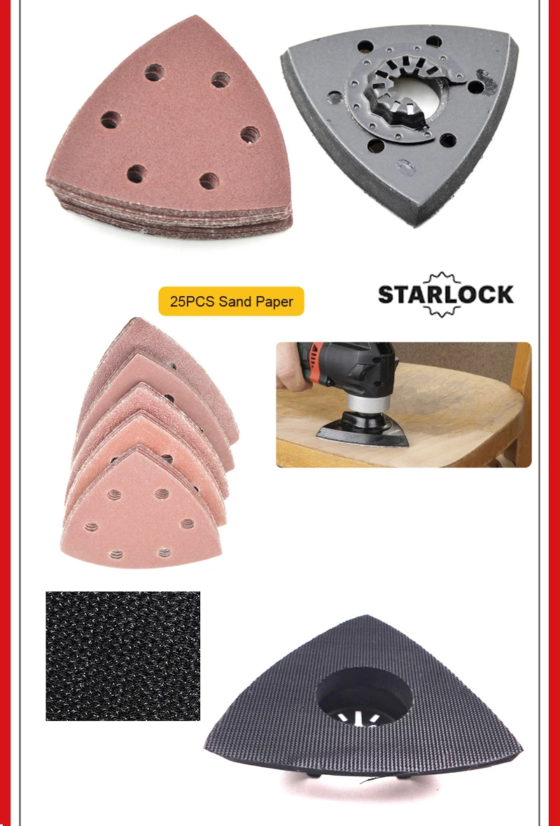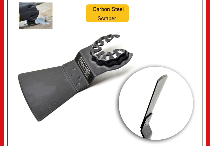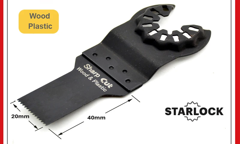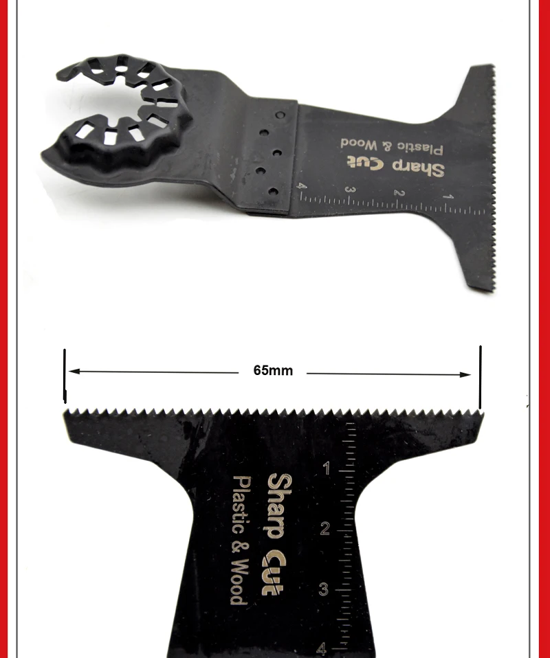 Feature | 2pcs 65mm triangle blades for wood and plastic 5pcs 32mm Bi-metal blades for soft metal cutting 5pcs 32mm Japanese Teeth blades for fast and precision wood cutting 2pcs 20mm carbon steel blades for wood and plastic 1pc straight carbide blades for tile edge cutting and clean 1pc triangle carbide blades for tile and concrete grinding 1pc 80mm Bi-metal Half circle saw blade for soft metal cutting. 1pc scraper 1pc sand pad. 1pc adapter. 25pcs sand paper. This blades can be fit for starlock system machines | ||||