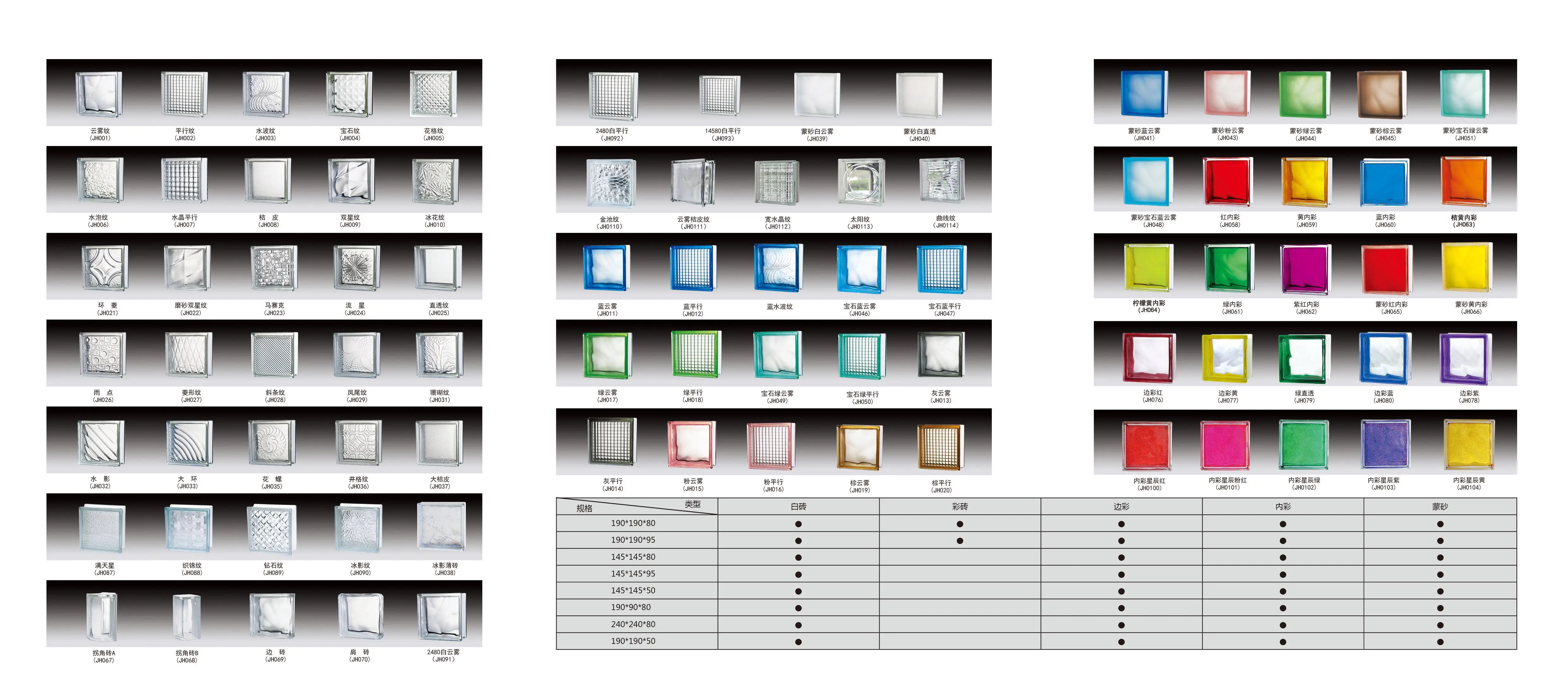Our glass block has the characteristics of high transmission and non-perspective. The transmittance coeffecient of clear color glass block is from 75% to 85%. The glass blocks are with many figures on the surfaces make the room to be full of soft light and comfortable feeling through the diffusion of light as glass block can diffuse lights.