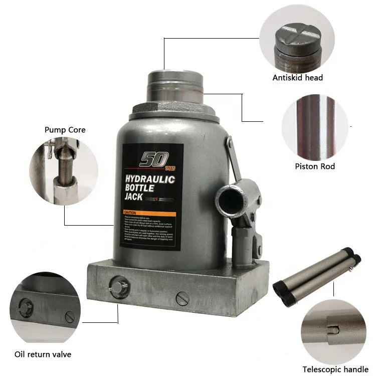1 Tighten the valve clockwise to ensure that the oil return valve can not be turned as far as it will go. 2 According to the height of the car body,select the height of screw out. 3 Insert the handle without groove into the end. 4 Place the jack near the tire of the car chassis ,and pull the handle up and down to reach the desired height. 5 After completion,loosen the valve one or two turns times anticlockwise,and press by gravity.This jack does not have the function of automatic lowering.Remember that the oil return valve cannot be loosened too much,or the jack leaks oil.
