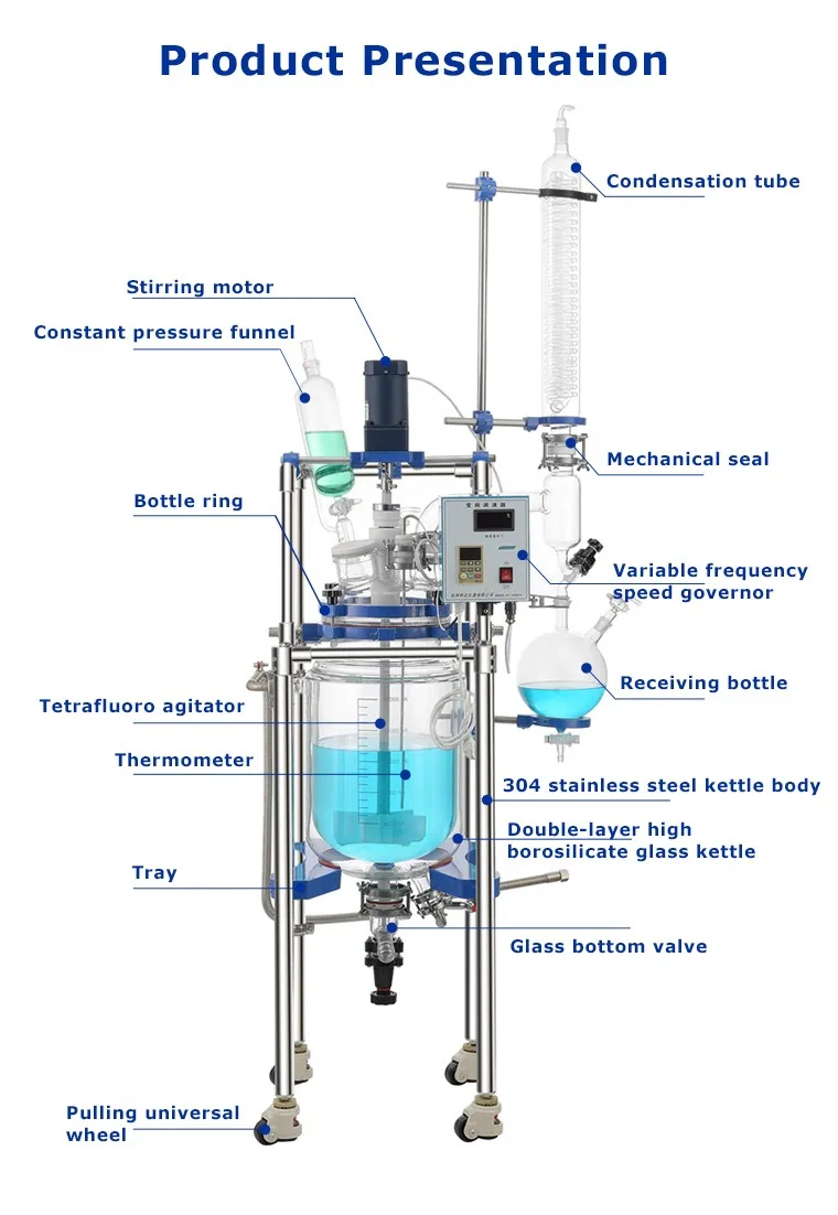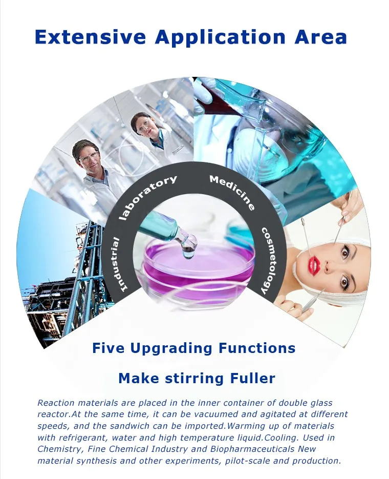 The lab jacketed chemical stirred glass reactor is designed double-level glass. The reaction material is put into the inner, which can be stirred. In the interbed with different cold and hot medium (refrigerating fluid, hot water and hot oil), do some heat circulation and cooling reaction. Under the constant temperature and ordinary pressure, as well as negative pressure, stirring reaction can be done in seal glass reactor, also back-flow, distillation. Etc.