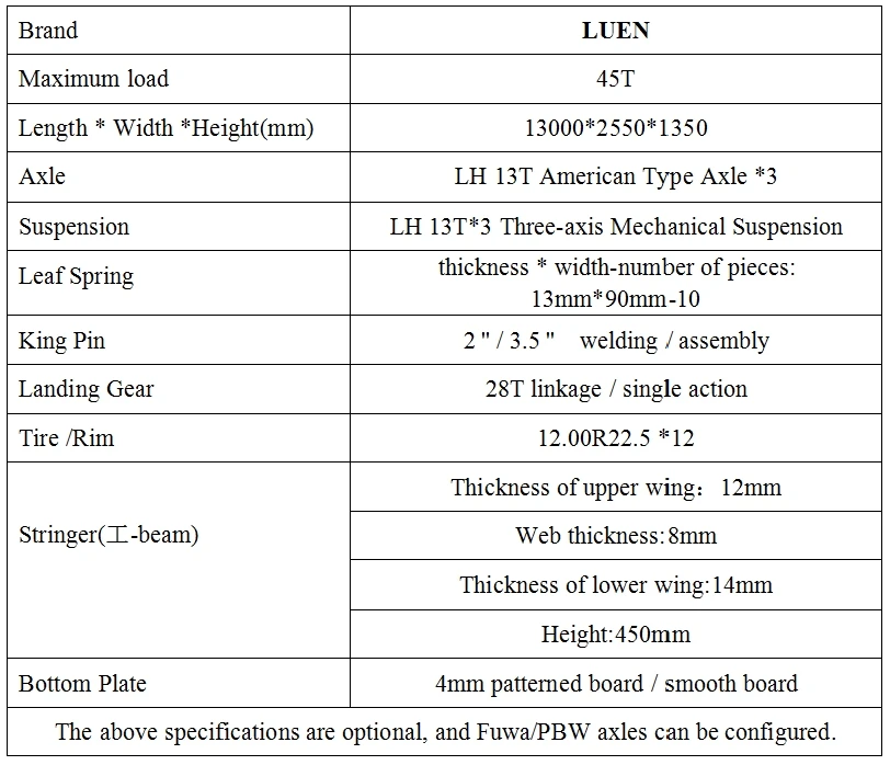 The above specifications are optional, and Fuwa/PBW axles can be configured.