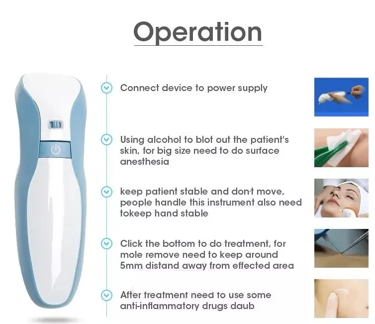 Plasma Freckle removal pen work principle : similar as carbon dioxide (CO2) laser beauty machine, it use new generation of plasma micro district discharge technology with low temperature and high frequency , it is efficient capacity conversion material and chip control . when the needle touch the freckle skin,it produce plasma with high temperature as 2000 ℃ immedicately, then it can carbide the spot freckle , removal it. When it touch the freckle ,spot ,it will produce a small flame,we called it carbide problem skin.The micro vascular will be solidified quicly without bleeding.Then it will formed carbon scabs ,protect wound skin from infection. After about 1 week, scab will sheeding without scar. | ||||||||