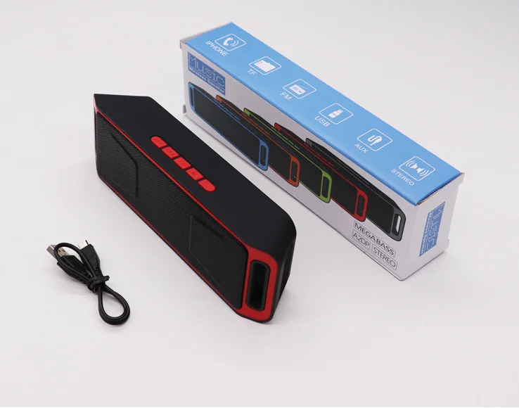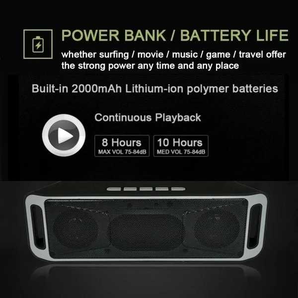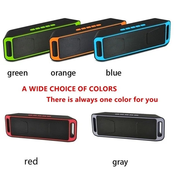 Specifications Use: Home Theatre,Portable Audio Player,Mobile Phone,Kara Model Number: SC208 Material: Plastic Audio port: TF/USB/AUX Speaker: Double speakers FM Frequency Range: 87.5-108MHz Frequency Response: 100Hz-16KHz Battery: 3.7V 1800mAh lithium battery Charging interface: Micro-USB Input voltage: DC5V-500mAh Special Feature: Wireless,Portable,Mini Display Screen: No Audio Classification: Sound Card Speaker Structure: Sealed Interface Type: USB Remote Control: No Playback Function: MP3 Item size: Approx.20*6.2*4cm FM radio: YES Playback time: up to 8 hours Charging time: 4-5 hours Color: Red/Gray/Orange/Green/Blue