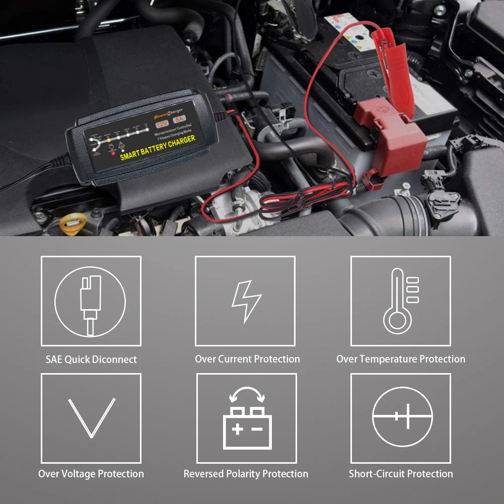 (2)Multi-Protection - EPA1205MT trickle battery charger ensure ultimate safety protect against Reverse Polarity, Short Circuit,Over Voltage/Current, Over Charge/Discharge, Overload, Overheat; Spark proof during lead connection; Water and dust resistant battery tender charger, full-loaded and burn-in test: