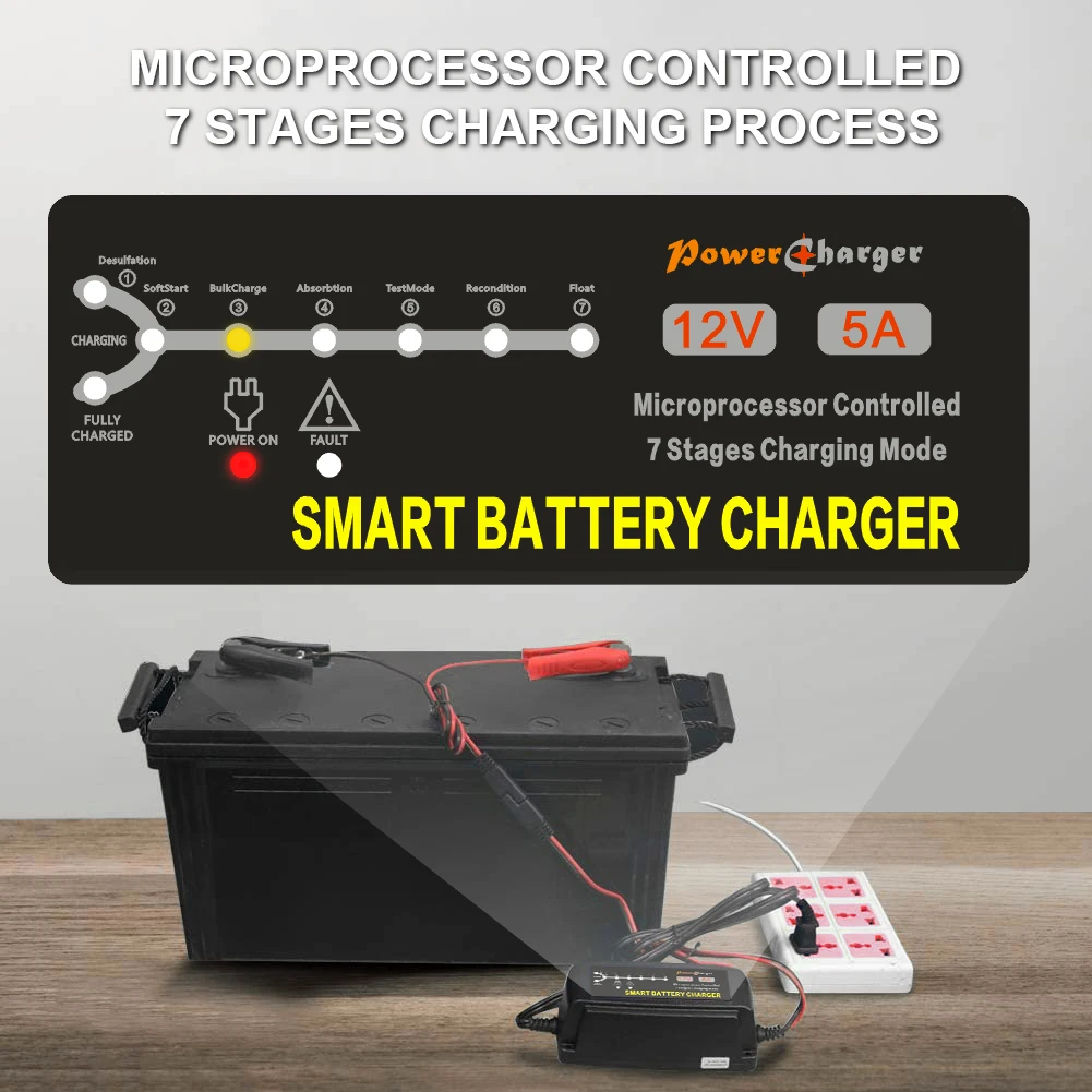 (3)7-Stage Automatic Charging - [Desulfation - Soft Start - Bulk Charge - Absorption - Test - Recondition - Float], charge and maintain your battery wherever you go; this motorcycle battery charger monitor the whole charging process, automatically switches to float mode after fully charging the battery by MCU controlled; this battery trickle charger will recover batteries more effectively and extend the battery life.