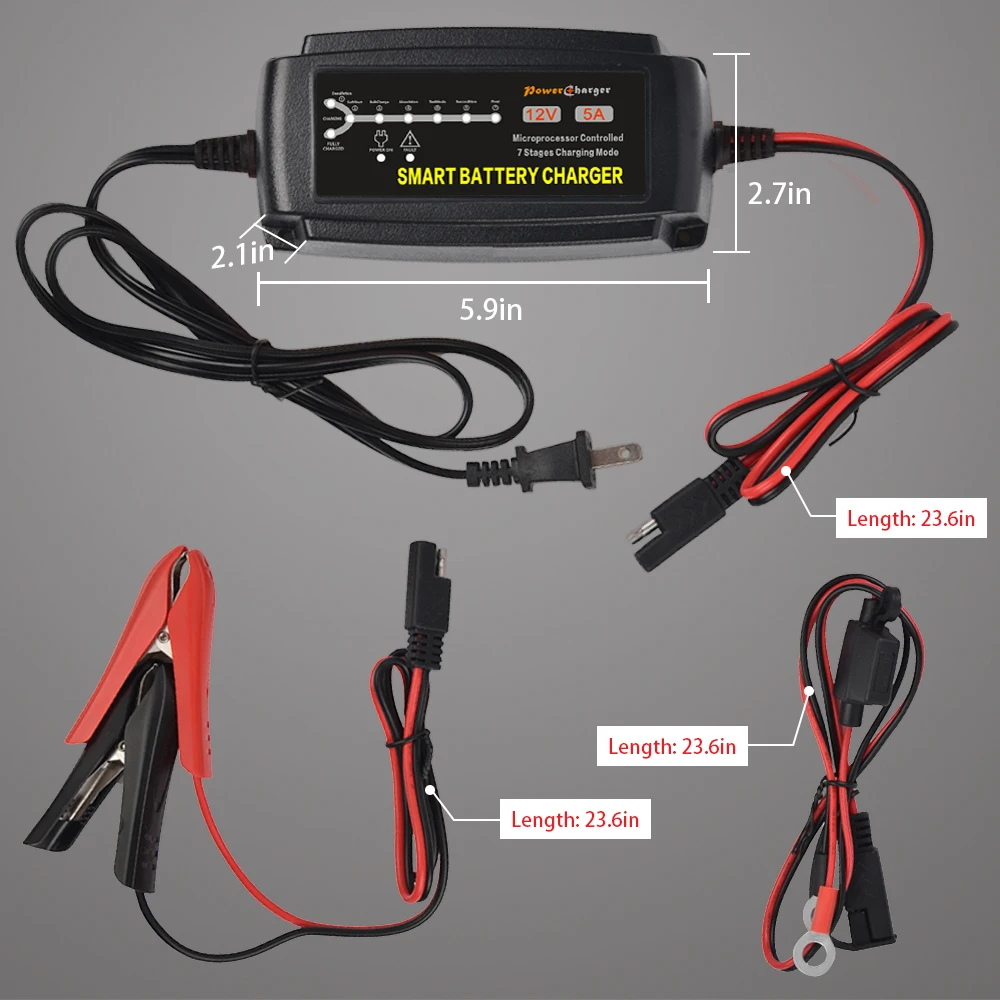 (4)Intuitive LED Indicator - 12V 5A deep cycle battery charger provide visual feedback of battery capacity and diagnostic information accordingly, efficiently prolong the lifetime of the battery. Input 100-240V, ultra-compact, portable and lightweight with the mounting holes, easy to carry the boat battery maintenance charger everywhere.