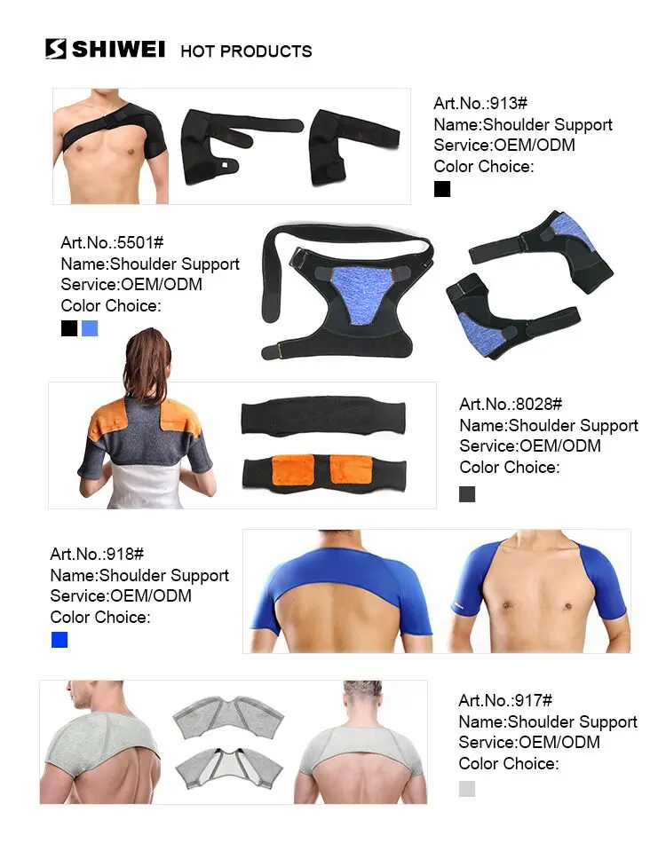 The shoulder support is used to prevent or alleviate the pain due to muscle cramps and injury. The elastic material can provide help for maintaining body temperature, vaccelerating blood circulation, and facilitating rehabilitation.