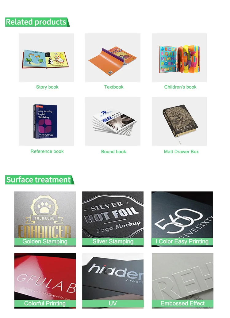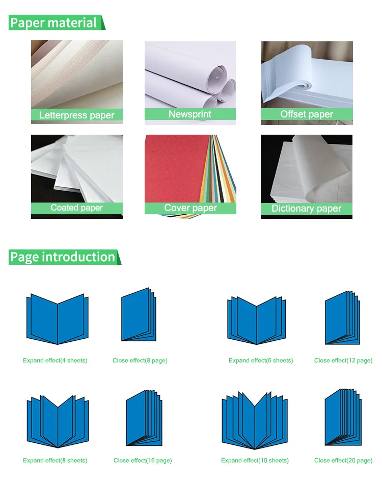 Binding | Casebound binding, paperback binding, sewing binding, perfect binding, flexi-bound binding, Saddle stitch binding, wire-o binding, Spiral binding, glue binding, pad binding,etc. |