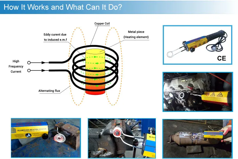 This device adopt Electro-Magnetic induction theory, can fast heat small metal parts on auto or machines. Mainly used for heating Rusted/ Frozen/ Corrosive Bolt, Nut, Fasteners, Suspension Nut, Gears, Pulley, and Bearings etc. Meanwhile, it also can help removing stickers on cars.