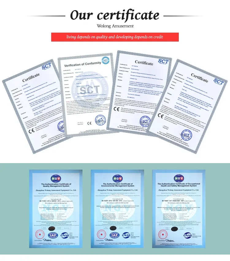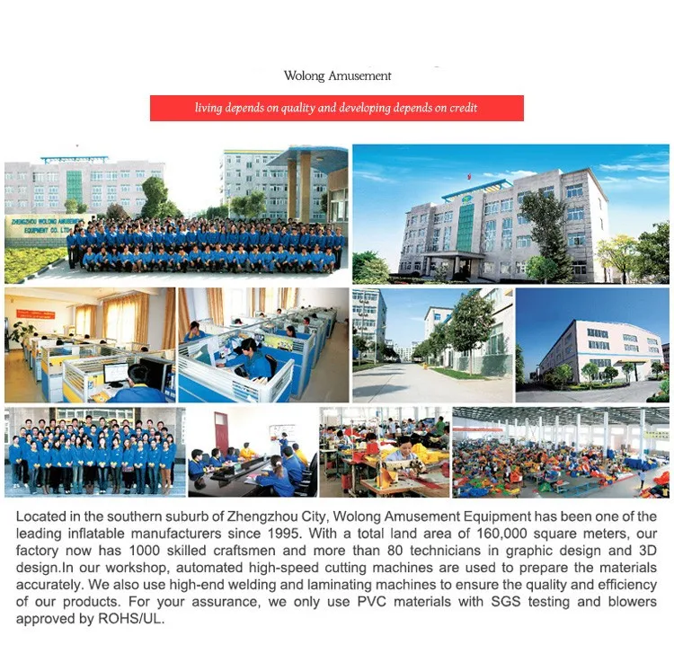 Zhengzhou Wolong Amusement Equipment Co.,Ltd was founded in1995, lies in Zhengzhou City, covers more than 40 acres. Wolong is a professional manufacturer engaging in R&D, production and sales of large inflatable toys, water sports and leisure products, inflatable advertising media products, which is a certified member of International Association of Amusement Parks & Attractions (IAAPA) and China Association of Amusement Parks & Attractions(CAAPA).