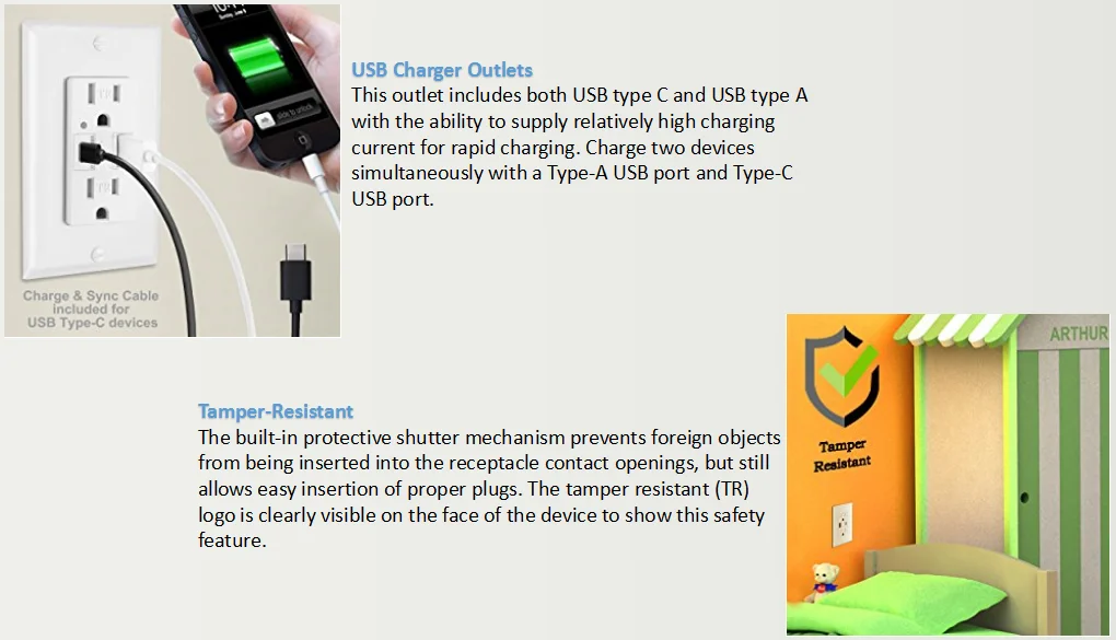 Tamper resistant --- The wall outlet with tamper-resistant (TR) shutters enhances electrical safety, preventing unwanted objects from being inserted into the outlet