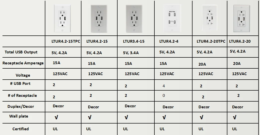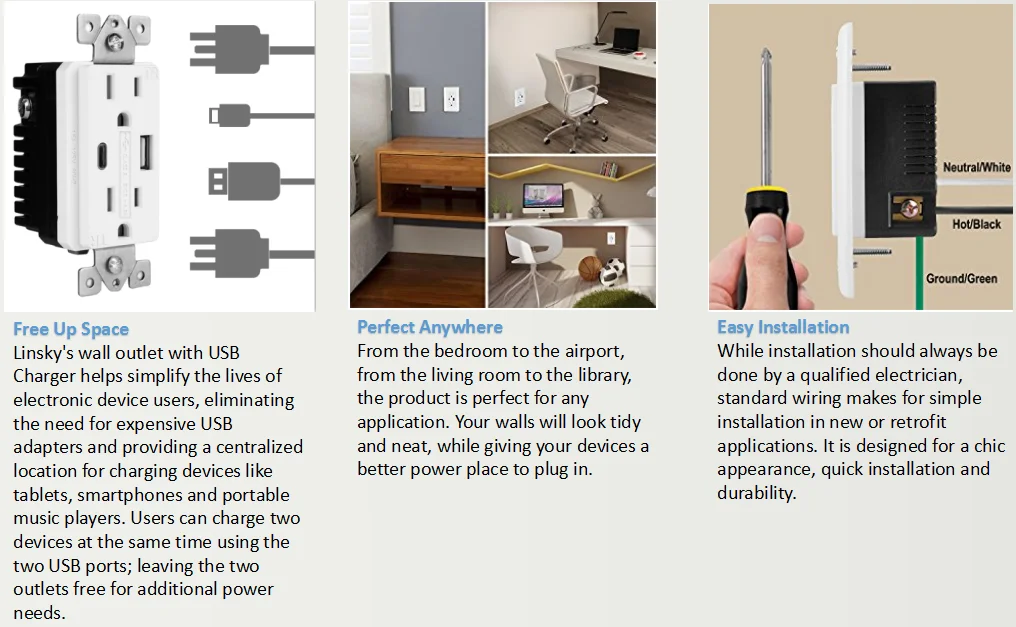 Product Name | Linsky Dual USB (Type-C & Type-A) Charging Ports (Total 4.2A/5V), 15A TR PD power and QC3.0 USB charger Duplex receptacle | ||||||