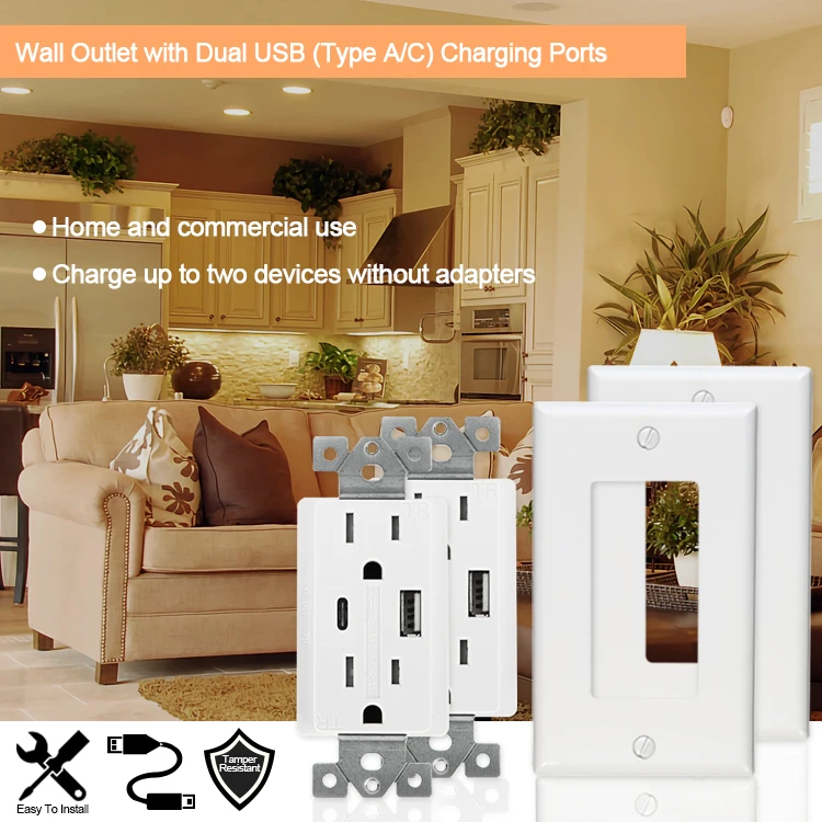Dual USB charging ports (Type-C & Type-A) --- The USB wall outlet includes ultra-high speed Type-A and reversible Type-C USB ports with total output 4.2A/5V and max 2.4A/5V for each port.USB outlet simultaneously charges two USB devices without adapters while freeing up both outlets for other power needs. Inculded 2 decent USB Type-C cables, conveniently charge your device