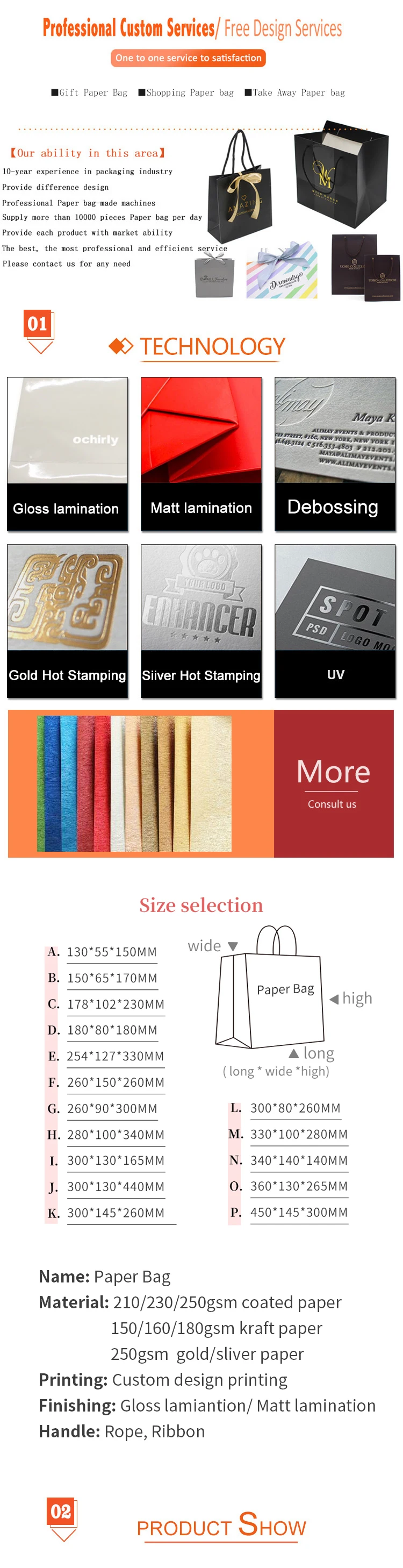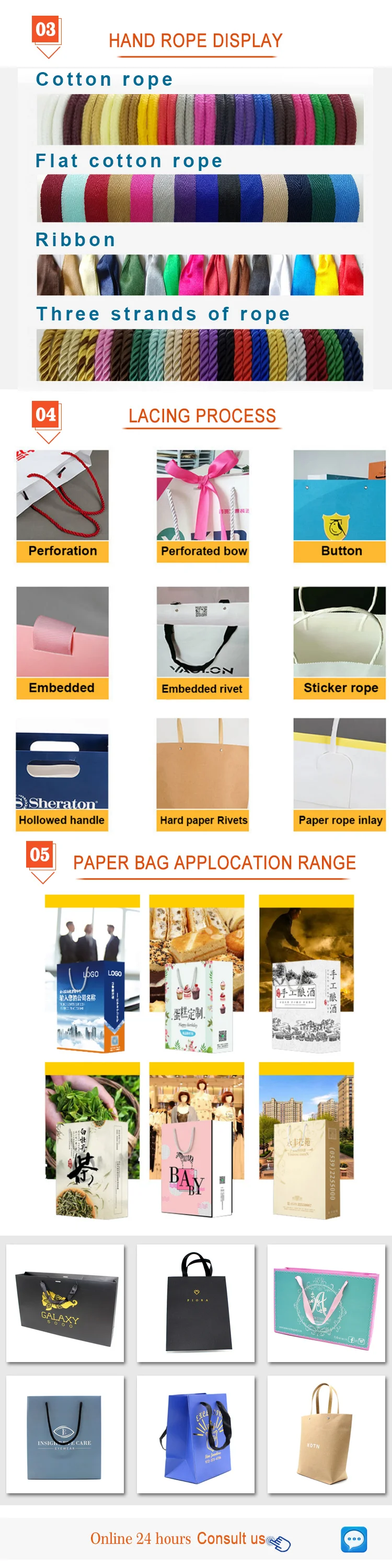 *Handle Types | Ribbon Handle, PP Rope Handle, Cotton Handle, Grosgrain Handle, Nylon Handle, Twisted Handle, Flat Paper Handle, Die-cut Handle or Customized Handle | |