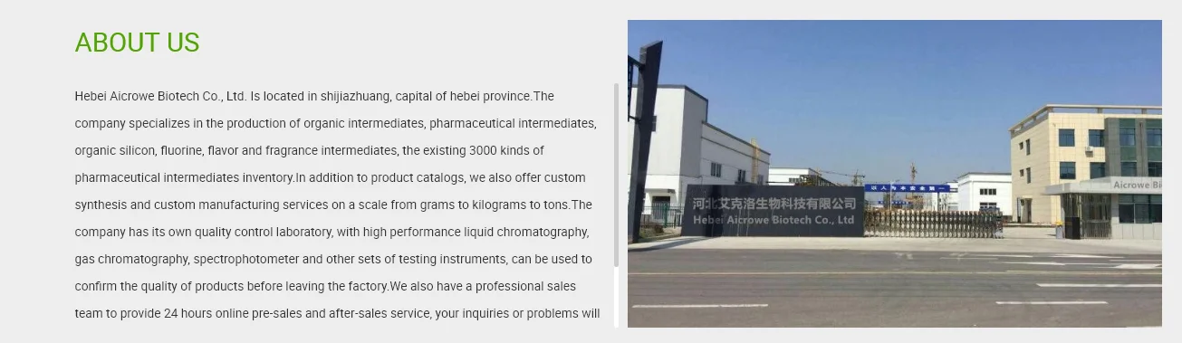 Hebei aiklow biological technology co., ltd. is a high-tech innovative enterprise specializing in research and development, production, sales of chemical raw materials, pharmaceutical intermediates, custom synthesis as the main direction, while providing drug technology development, technical consulting, technology transfer and other services.