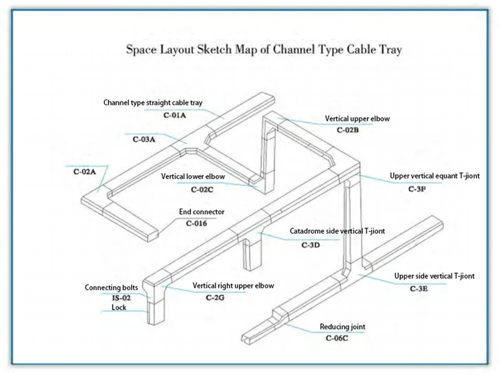2)The installation of cable tray can be made for different surroundings. It may be installed aerially along pipeline beneach ceiling and beam, on the wall, column, tunnel, cable trench and pillars, etc.