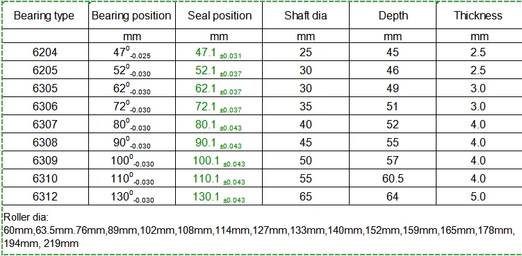 | OD (mm) Bearing | 60 | 63 | 76 | 89 | 102 | 108 | 114 | 127 | 133 | 140 | 152 | 159 | 165 | 176 | 194 | 219 | 245 |