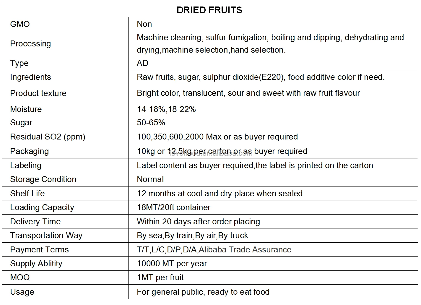 Documents | We can supply proforma invoice, commercial invoice, packing list, bill of lading, certificate of origin, phytosanitary certificate, quality certificate, health certificate by China customs, fumigation certificate,COA/test report by CIQ or third party, export declaration,etc. |