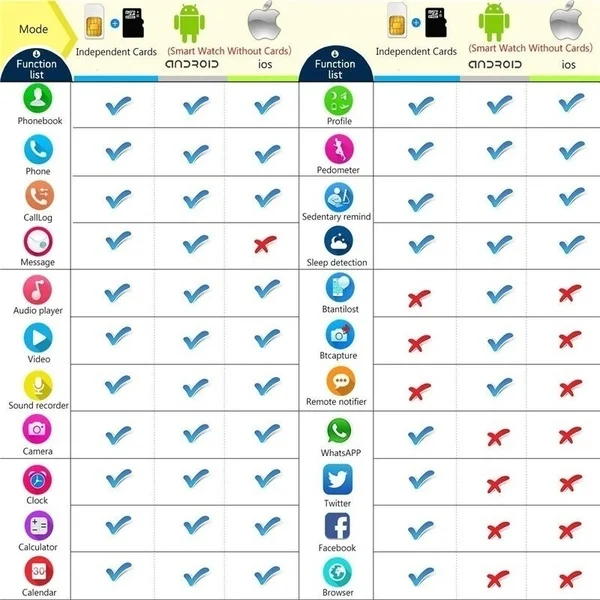 NOTE: Android Phone can use this watch's all functions; BUT IOS only support: Passometer, Calendar, Call Sync,Calculator,Clock,Stopwatch.