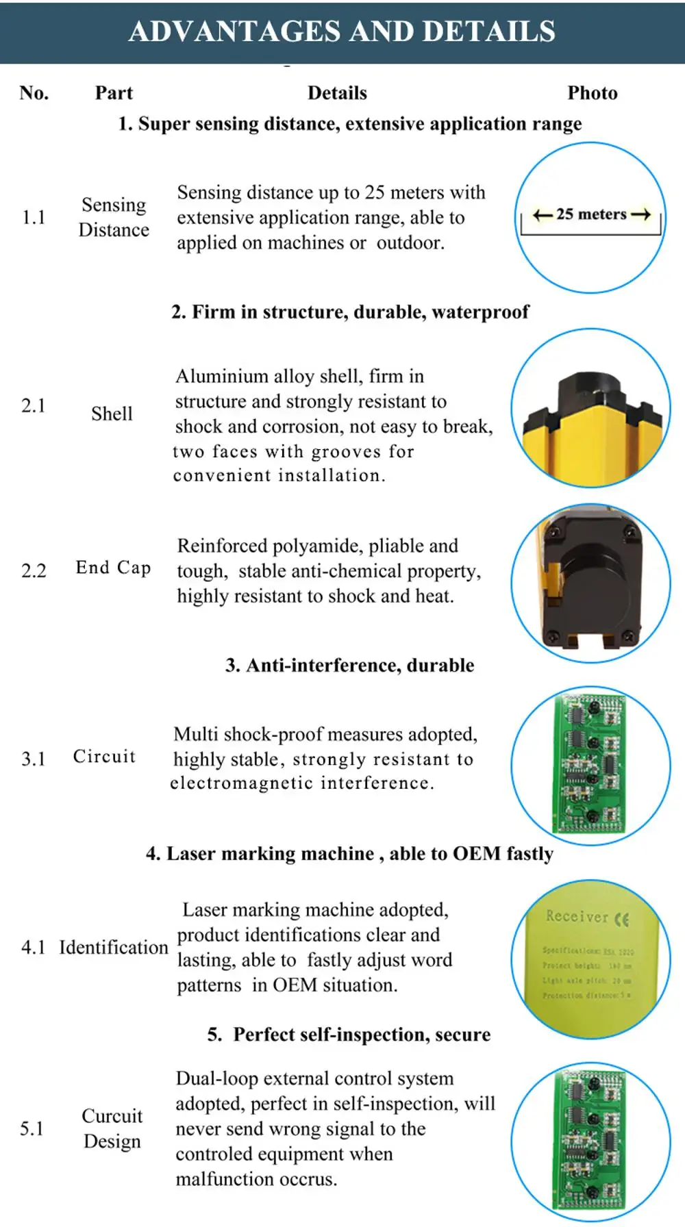 Sensing Distance between emitter and receiver | 5 meters (Standard),others can be customized | Sectional Dimension | 35*50mm | ||