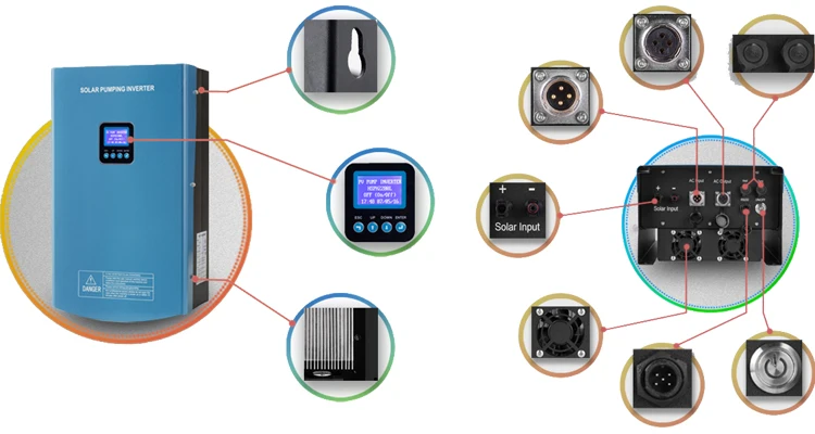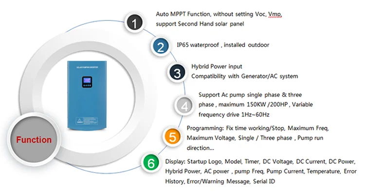 Protection | Solar DC Input Low/Over Voltage; Solar DC input Reverse Polarity; AC output Short-circuit; Over Temperature; Over Flow of Tank; AgainstLightning; AC Input & Output Phase Lose; Dry-Run (detecting by Sensor or Software); AC output Unbalance | ||||