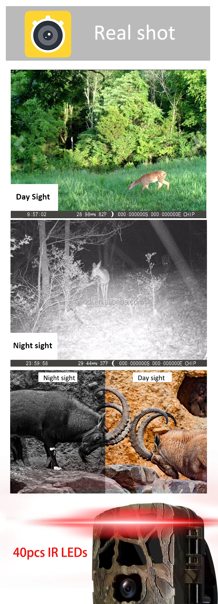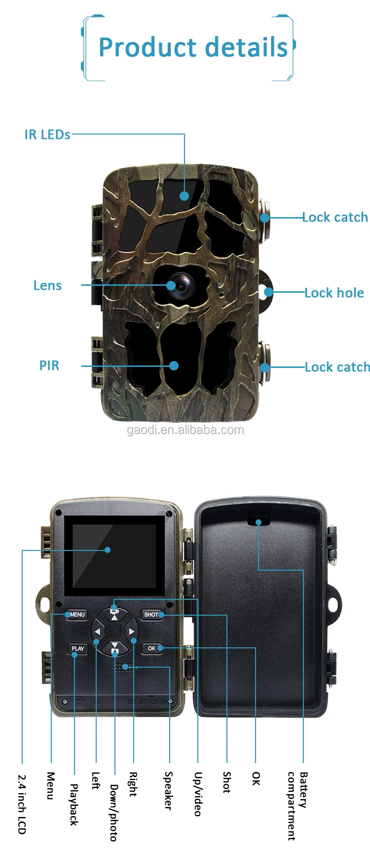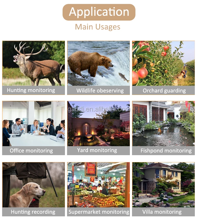 Power supply | 4* or 8*1.5V AA battery/solar charger/Support external DC 6V 1.5A | ||||||||||||