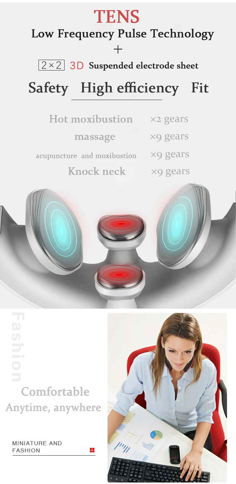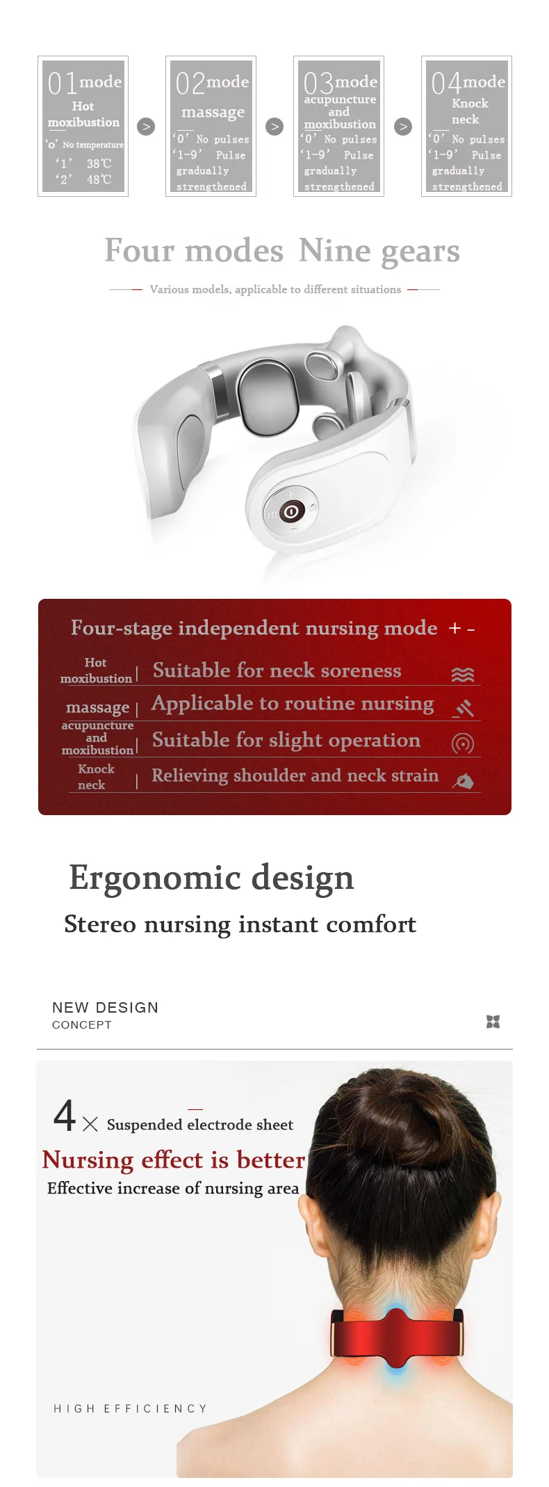 1. There are 4 electrode pads, covering acupuncture points more than the ordinary 2 heads on the market, the area is wider, more comprehensive and precise 2. There is heating function - hot moxibustion. PID thermostat control technology, double combination of heat and physiotherapy, better massage effect 3.433MHz wireless remote control + voice broadcast prompt, more convenient operation