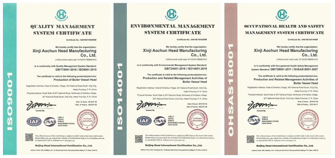 In 2006, the company obtained the A3 head manufacturing license issued by the state.In the past 20 years, Xinji Aochun Head Manufacturing Co., Ltd has established a long-term cooperative relationship with more than 100 pressure vessel and boiler manufacturers with its solid funds, sound quality assurance system and stable product performance.