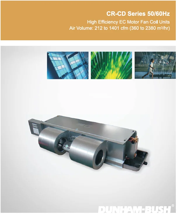 Meeting building owners' demand for increased eneray efficiency throughout the heating, ventilating and air conditioning (HVAC) system, Dunham Bush has adopted the innovative electronic commutation (EC an motor technoloay throughout our new CR-CD range of chilled water fan coil unit. This state-of-the-art echnoloay offers office and commercial buildings substantial eneray savings and improved user comfort.EC motors (EC = Electronically Commutated) using electronic commutation of motor windings require five times less energy (Watt) than conventional Alternating Current (AC) motors in the low speed range While conventional AC fan motors run on fixed speeds. EC fan motors run at all speeds throughout the entire operating range of the unit, with the motor rpm-controlled via a 0 to10 Volt si?nal from a unit controller. Without perceptible sound shift when modulating the fan speed to adapt to minimum cooling and heating load variations. increased acoustic and thermal comfort is ensured.