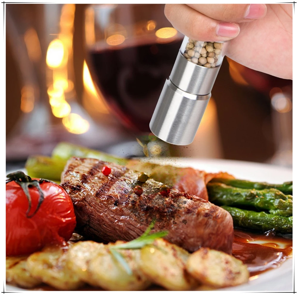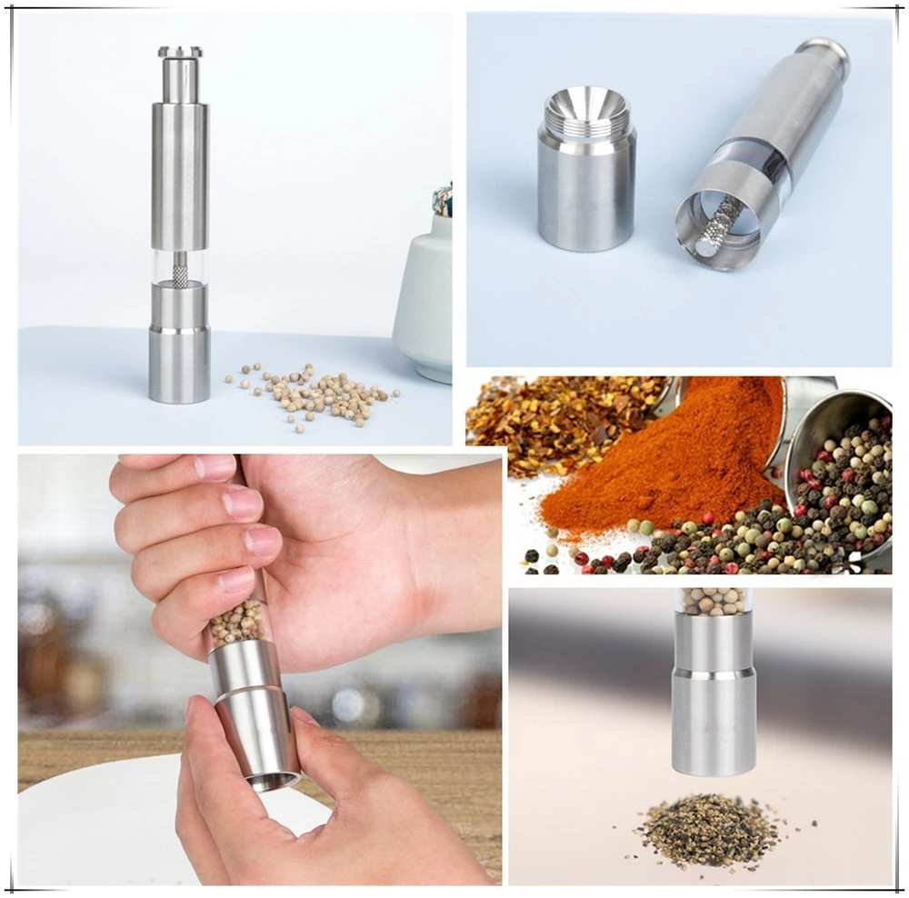 •\t✓SUPER CONVENIENCE -- Solid stainless steel salt and pepper grinder. Just fill up with salt or pepper and then push the nozzle down and it grinds easily