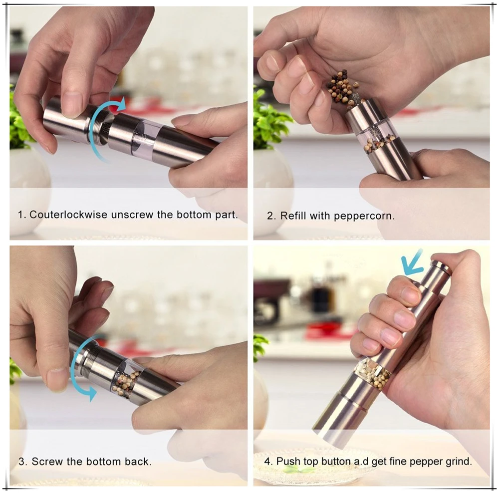 All these series works the same way, simply press the top button to send the grinding rod down through the contents of the mill to add fresh ground salt and pepper to any dish or recipe. Having more than one salt and pepper grinder in your home or kitchen makes daily life just a little easier. Keep a set of salt and pepper mills on the dining room table and another on the kitchen counter for easy access while cooking. These series can be ordered come with a acrylic mess-free stand to keep residual salt and pepper from messing up your countertop or table. Normally ordered as a set of 2 pcs, 1 can for salt use, the other for pepper use. We recommend ordering these items with color rubber coating, that can make them easier to grip and adds a bit of color to your kitchen or dining room. We also recommend using small to medium salt granules, not overfilling them, so that the grinding rod has room to move and storing your salt and pepper in a freezer size plastic bag or container to allow for easy refilling. Simply remove the solid metal base, scoop in what you need and you are back in business! Easy to use, Easy to refill!