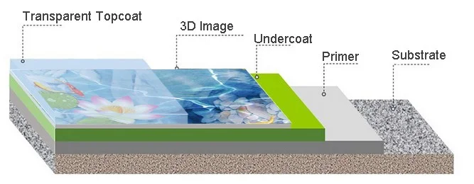 Apply the self-leveling epoxy primer. Install the 3D floor mural. If the basis of the pattern chosen is 3D floor mural, make sure bonding to the substrate was nowhere folds or creases. Install 2 layers of clear epoxy or more often, polyurethane to build a transparent layer of epoxy coating over the 3D floor mural.