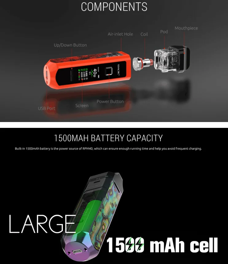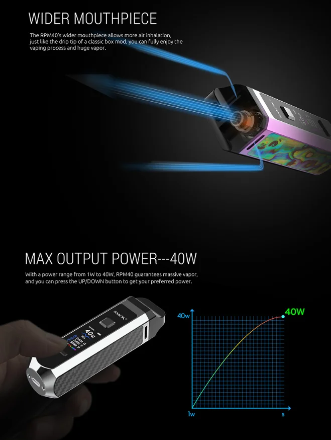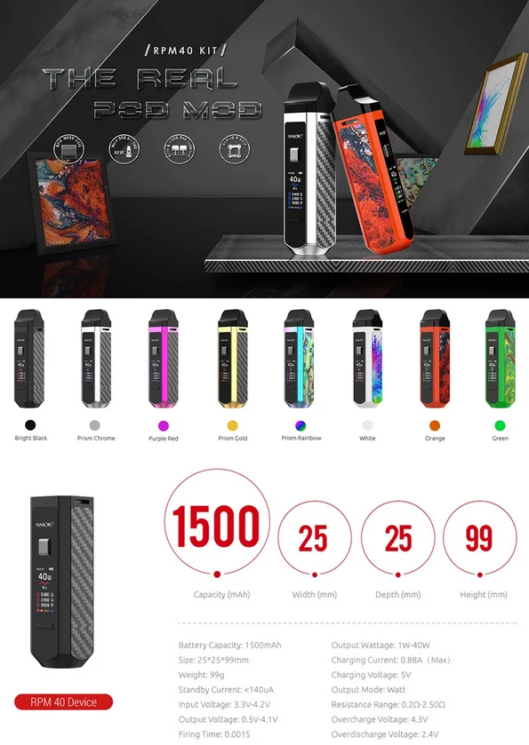 SMOK RPM40 Pod Mod Kit is an ultra-portable pod mod that shapes like a cuboid and is covered with glossy finish and characteristic material, making the whole device look fancy and stylish. It is small in size but has a battery capacity of 1500mAh which can ensure enough running time and help you avoid frequent charging, and a power range of 1W-40W for you to adjust, and you can press the UP/DOWN button to get your preferred power. The internal IQ-R chip is a new one, shortening the firing time to 0.001S, and charging time to two hours. Different from normal tiny and slim pod devices, RPM40 is designed with a 0.96-inch screen, with which, detailed vaping data is clearly presented, like the wattage, resistance, voltage, screen color, puff number, and battery level. Besides, the newly designed RPM Mesh 0.4ohm Coil is designed for the best flavor and excellent vapor production. Innovation keeps changing the vaping experience!