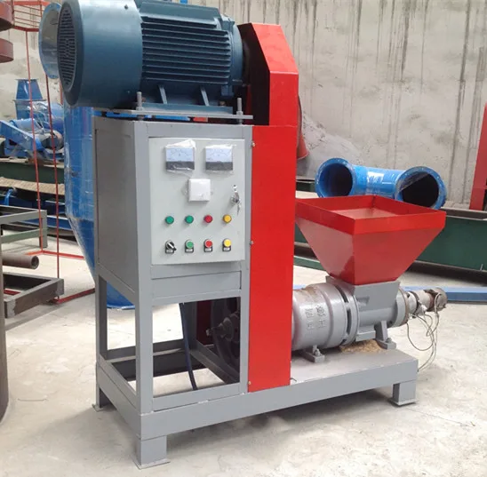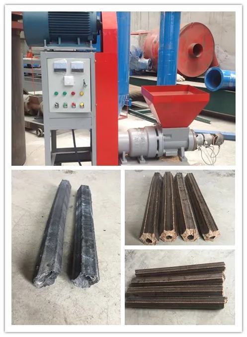 The charcoal making machine is to process sawdust, straw(corn straw, soybean straw, sorghum straw, cotton stalk, rape straw, peanut, sunflower stalk), rice husk, grasses, shrubs, bamboo head, butts, bagasse on the force of crushing from a high temperature and high pressure area produced by a screw propeller and heating laps to make those raw materials into hollow briquettes.