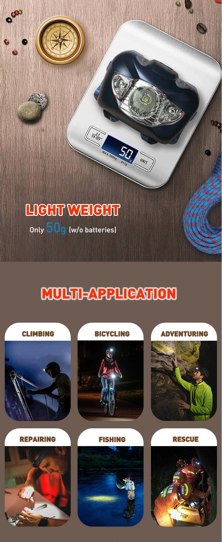 6. Aluminum Alloy Headlamp ( Rechargebale or dry battery)