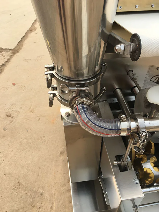 4 The mechanism of the skin, producing a tube dough, filling injection molding in one of the high degree of automation, compact structure, equipment maintenance, easy to clean and simple.