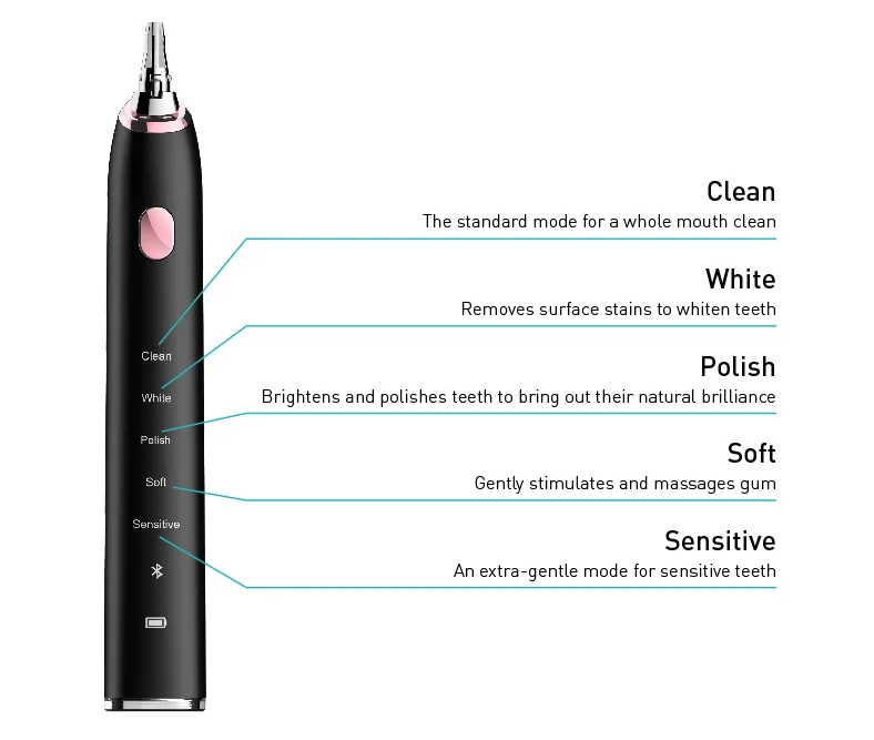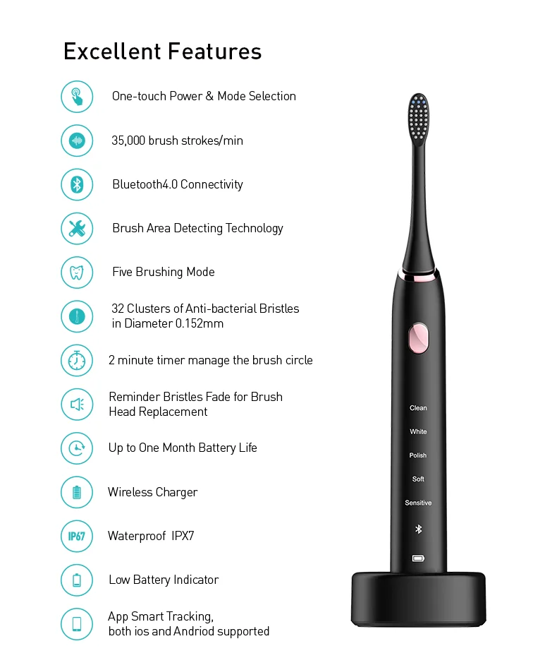 Standard Package: | 1*Smart toothbrush body,2*Brush head, 1*charger ,1*user manual | ||