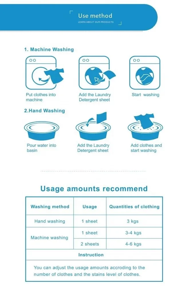 This is the new type laundry products. It can be dissolved totaly in water. Good to environment. The laudnry sheet adopts the most latest formula with modern science & technology. It has the ability to get rid of the stubborn stain and heavily soiled fast and easy. It cleans strongly, save time and energy. The formula is especially made for machine wash, it increase the cleaning effect and at the same time decrease the foaming to protect your wash machine.