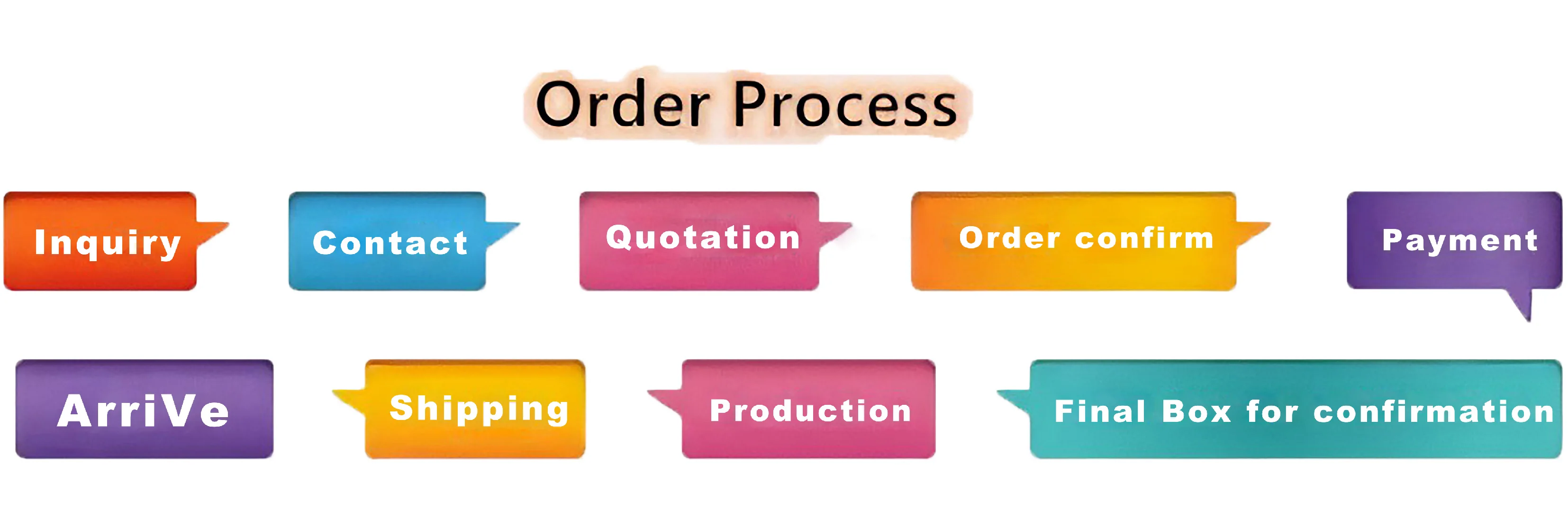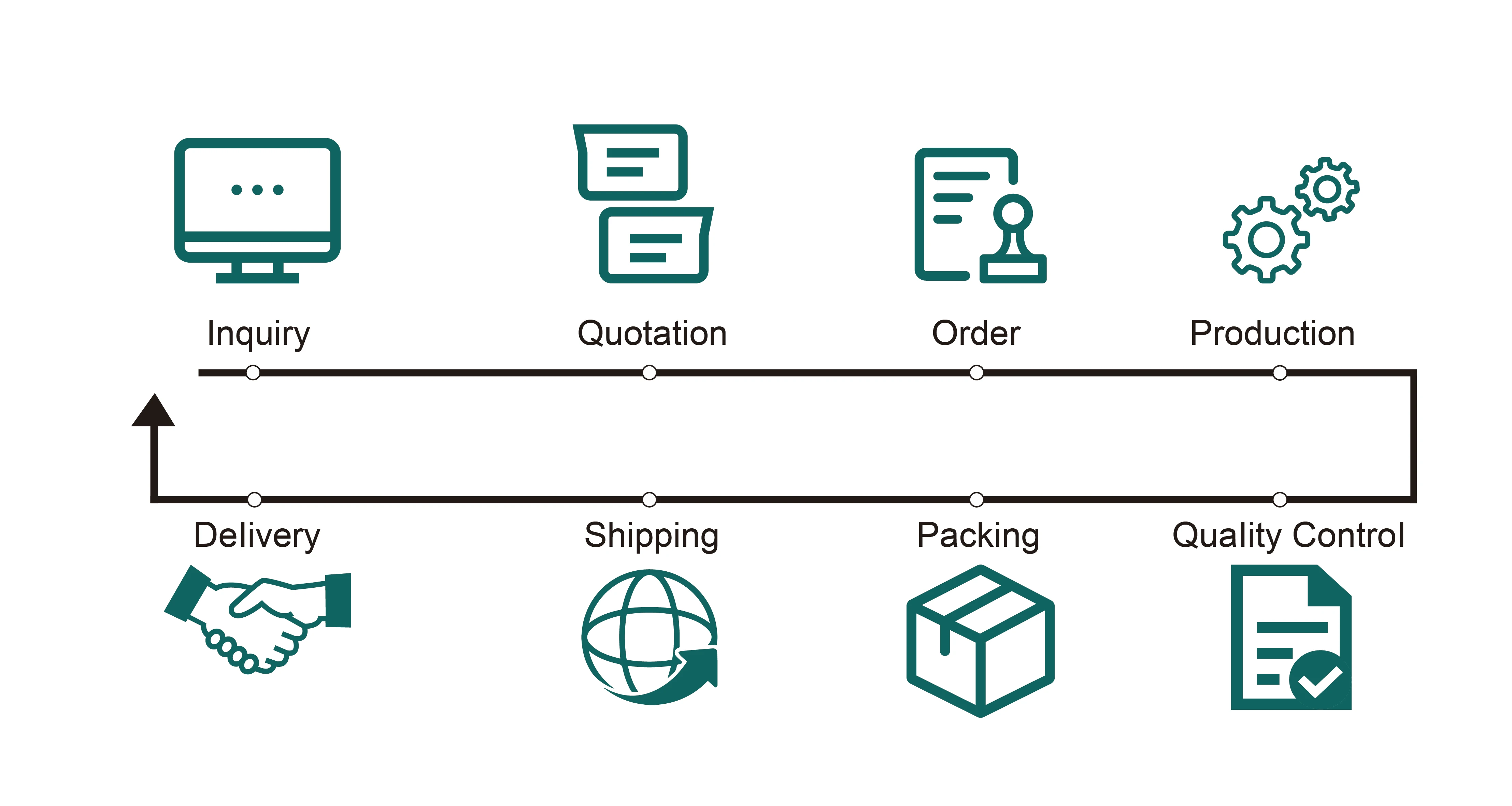 Send us inquiry--- receive our quotation-negotiate order details-confirm the sample-sign the contract-pay deposit-mass production-cargo ready-balance/delivery-further cooperation.