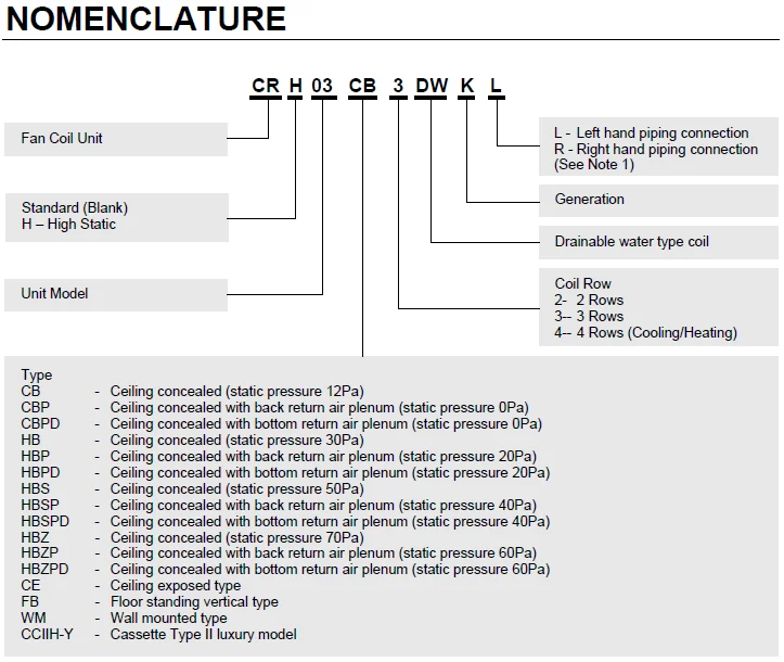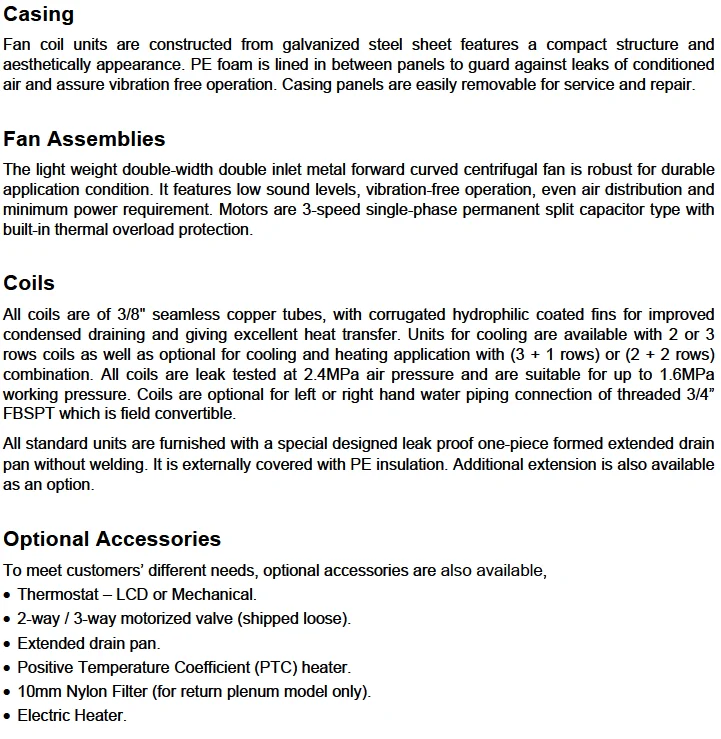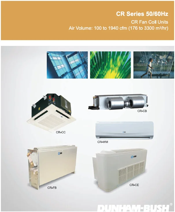 For more than 100 years. Dunham-Bush has focused on innovative product development. Today, we provide a full portfolio of HVAC/R products from Fan Coil Units to large centrifugal chillers as well as many other innovative green solutions. Our commitment to innovation, matched with an aggressive attitude toward qrowth, makes Dunham-Bush a leader in global markets. Our product development is tailored to meet the specific needs of customers, building-by-building, country-by country and region-by-region. No other HVAC/R manufacturer takes this approach to meeting your performance expectations.CR Series. chilled water fan coil units, have an air volume range from 100 to 1940 cfm (176 to 3300 m/hr) in 50/60Hz version with 3 basic types (blow through ceiling concealed units, blow through ceiling concealed with back return air plenum units and blow through ceiling concealed with bottom return air plenum units). The entire product line features compact construction, design flexibility high performance and low noise. All fan coil units are completely factory packaged with blower motor, cooling/ heating coil and terminated pipe connections. They are completely factory assembled and ready for field installation