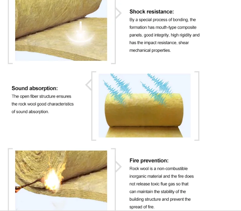 3.Rock wool blanket products using high-quality basalt as raw materials,with good non combustible properties,melting point in 1000℃ or more,in the insulation of fire,reduce orabsorb noise isparticularly