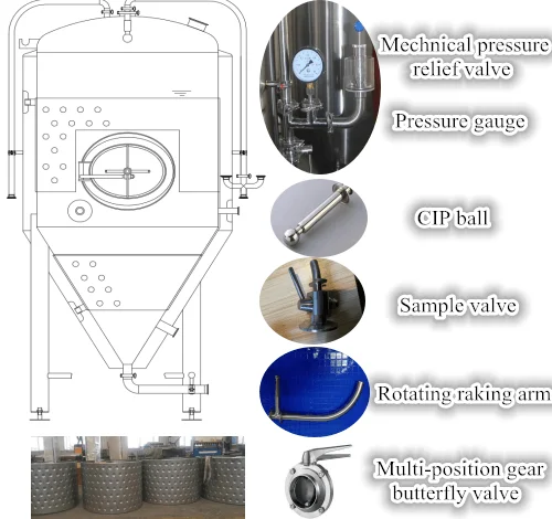 08 | Accessories | Sample valve, Pressure gauge, Breath valve, Temperature gauge, Top manhole, Washing ball, Butterfly valves, CIP Arm, Hop port, Discharge arm and so on. |