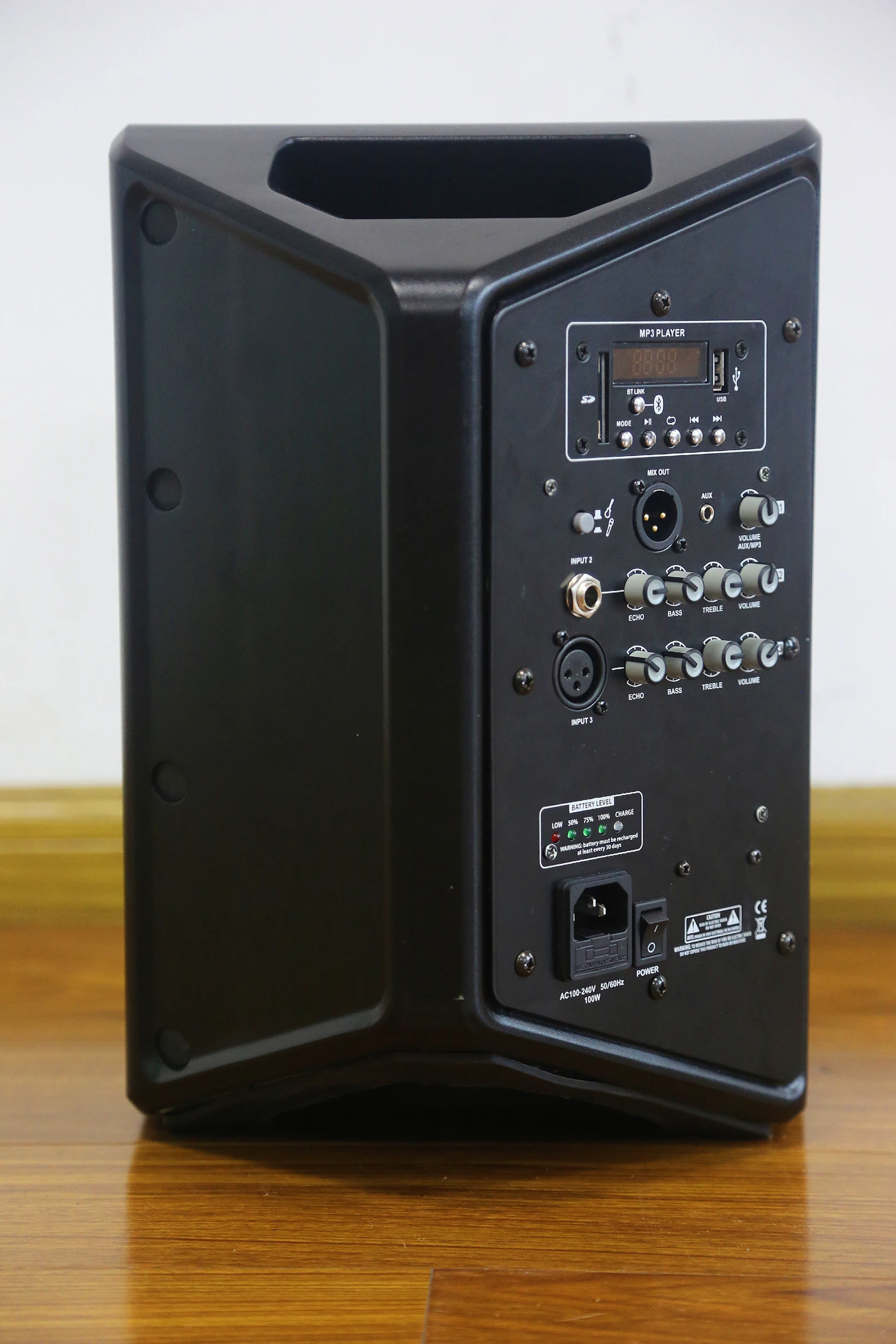 A: Bluetooth, folder mp3, USB / SD, FM, NFC, battery, handle and wheels, with LED ring, remote, EQ effect, built in light show, different color grille for your option.