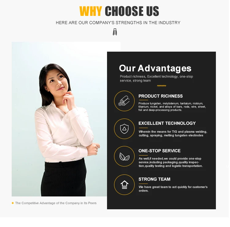 We have hydrogen production, annealing furnace,rotary forging machine, chain, all kinds of wire drawing machine, grinder, and other rare metal processing equipment. And we can produce tungsten, molybdenum, tantalum, niobium, titanium, nickel, and its alloy bar, bar, wire, plate, foil and its deep processing products ect. Among them, tungsten wire (rod), thorium tungsten wire (rod), tungsten alloy wire (rod), white washing,straightening or disc, polishing are widely used in electric vacuum, electric light source industry, its superior performance, has