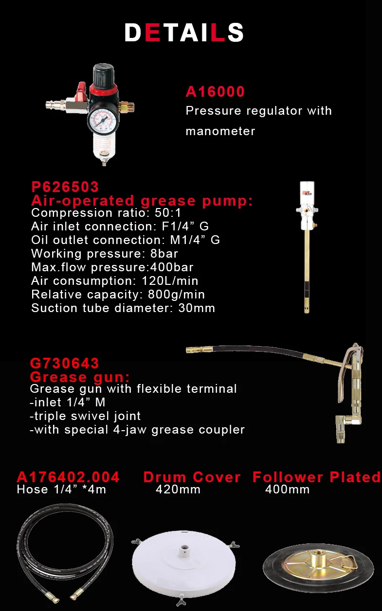 The solution of Lubricating Oil system. It ranges from the Waste Oil drainer with different capacity of 65L,90L&115L, Oil Grease Pump, the Oil and Grease gun and some different size of tolley. AIso we have many different sets of the Oi/ Grease dispenser and Central control system. They are widely used in the field of automotive after-sales market.