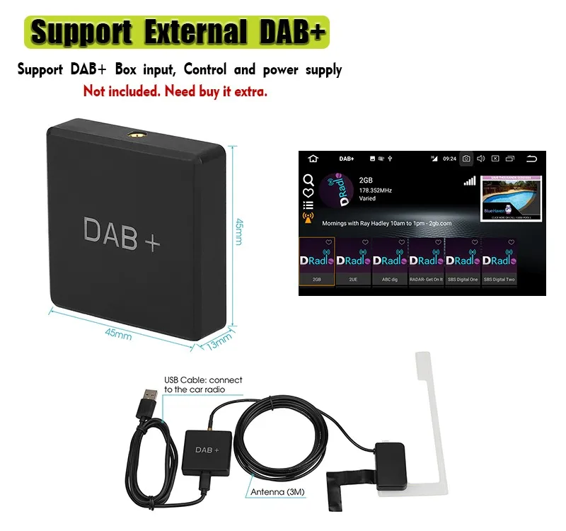 ▶ Built-in DAB+ System, just connect a DAB/DAB+ Box with USB Port to use this function.
