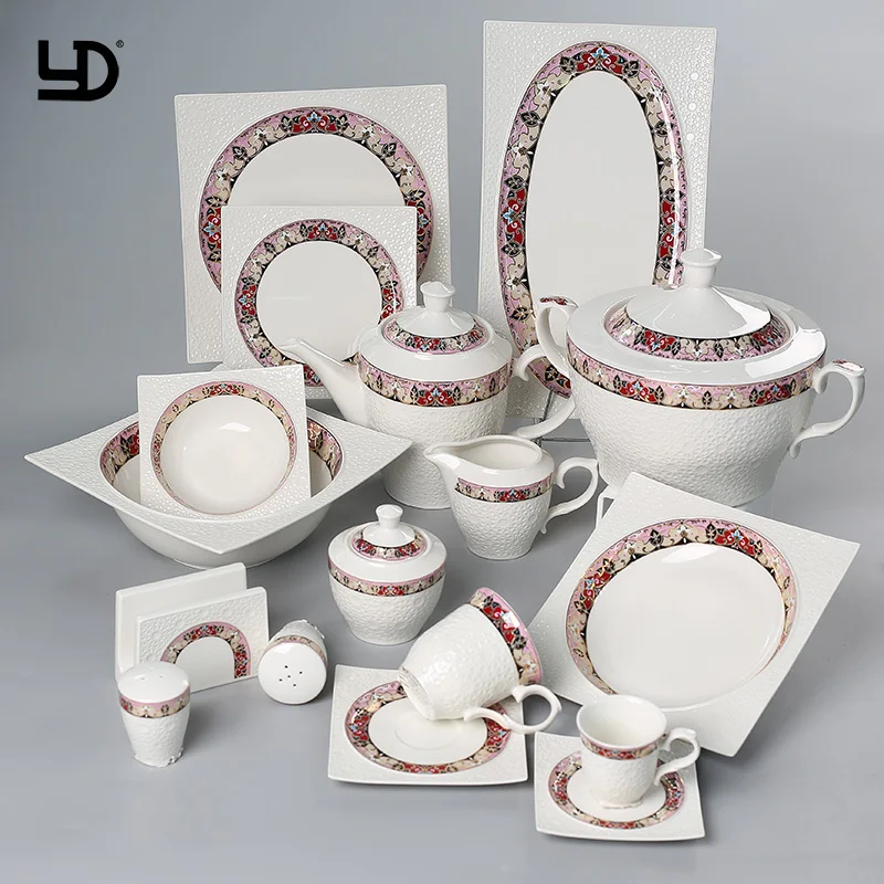 56 pcs | tea pot 1 + sugar pot 1 + milk pot 1 + cup&saucer 6 + stockpot 1 + big spoon 1 + soup spoon 6 + 7''plate 6 + 8"square soup plate 6 + 10''plate 6 + 14"rectangle plate 2 + soup tureen 2 + 5"square bowl 6 + 9"square bowl 1 + salt and pepper 1 + napkin holder 1 |