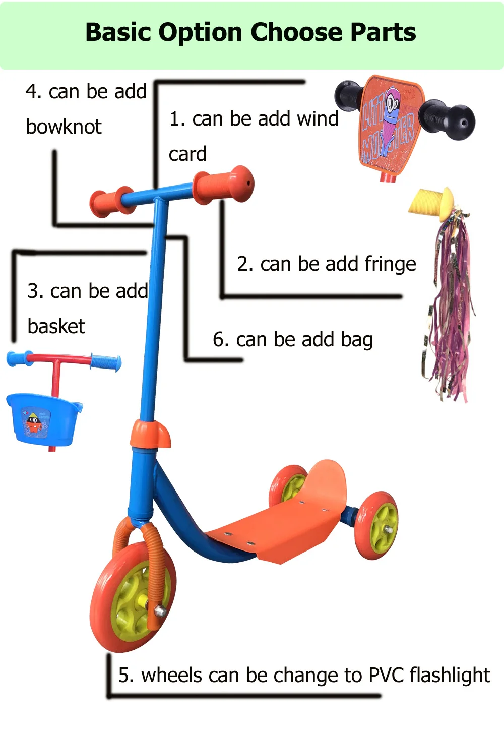 2. Wheel: | Front PVC 6inch, Rear 5inch | 8. Brake: | PP |